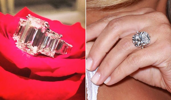 Take Our Poll“This is major bling! It is an emerald-cut diamond and has two large emerald cut diamonds flanking the center stone. This ring is a major attention getter,” Shari Fabrikant of Robert Fabrikant Inc. told us. “Since it is made up of flawless diamonds, full retail price for a flawless ring like that could cost anywhere from $$1,000,000-$1,500,000.”
