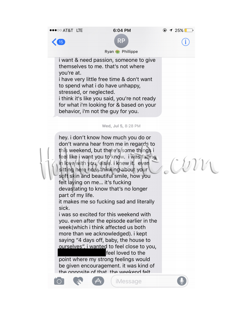 “Hey. I don’t know how much you do or don’t wanna hear from me in regards to this weekend, but there’s some things I feel like I want you to know,” Ryan allegedly wrote. “I was falling in love with you, Elsie. I knew it. Even sitting here now, thinking about your soft skin and beautiful smile, how you felt laying on me… it’s f–king devastating to know that’s no longer part of my life.” The message goes on, with Ryan allegedly writing that he “really hoped this wouldn’t end bad” and that he wished they “could be friends.” In the screen grabs, the contact shows Ryan’s full name with a little hat emoji between his first and last.