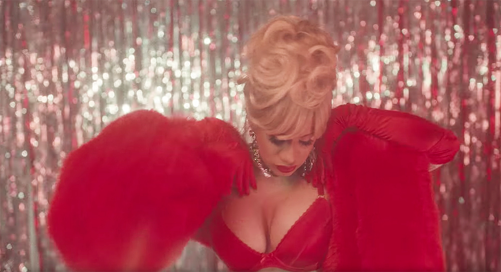In the impressive video, Cardi starts off rapping while wearing an incredibly sexy red bra and matching panties with a fur shawl over it, red gloves and extravagant jewelry. Her image can be seen on a small television screen while sexy shirtless men watch her. Although her stomach is covered by the shawl most of the time, she does show off little glimpses of her stomach and there may be a bit of a bump! We’ll admit that it’s hard to tell because of the different angles but it will be interesting to see her fans’ reactions after this one!
