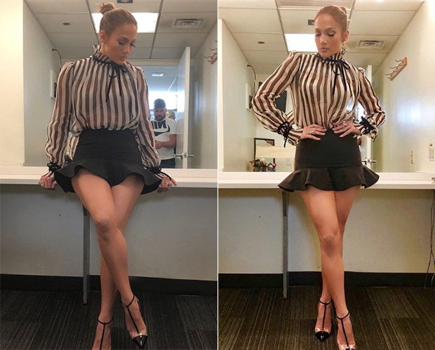 Jennifer Lopez was promoting her show World Of Dance and song “Dinero” doing press in New York City on May 9, and she wore one of her hottest looks ever! She was wearing a super short black ruffled mini skirt and striped skirt. She gave a shoutout to Valentino in the post, and the famous house wrote on their Instagram, “The one and only @jlo stands proud in a perfect black and white #VStripes look from the #ValentinoPreFall18 Collection designed by @pppiccioli.” J-Lo was clearly feeling herself in this look because she posted not one, not two, but three pics of her sexy outfit!