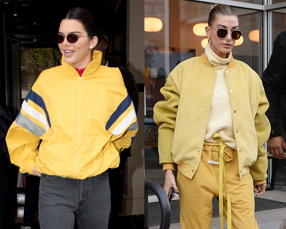 Sister Kim Kardashian, 38, kicked off her summer of neon in an eye-blazing yellow tracksuit jacket in May of 2018. She paired it with tight grey bikeshorts to take her kids on a trip to Disneyland, where her fluorescent look made her completely stand out among the crowds at the world-famous tourist attraction. One month prior, Kendall Jenner, 22, wore a sunshine yellow Balenciaga Spring 2018 menswear track jacket paired with Yeezy mom jeans during an outing while in Paris. You can see all of the Hailey Baldwin vs. KarJenner sisters yellow tracksuit looks in our gallery here.