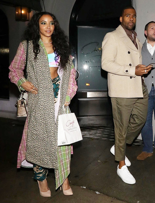 After eating dinner at Craig’s the two left the restaurant together. They kept their PDA to a minimum, but that doesn’t mean it wasn’t a date – they could be really early on in the dating process! Tinashe stepped out in animal-print pants, pale pink heels, a multi-patterned duster coat, and neon-blue sports bra. She also rocked an animal-print brown bag and let her chest-length hair flow. Tinashe’s makeup was appropriately fun for the evening, with green shadow topping her lids and she wore a nude-color lipstick. Mario’s look was more reserved, and he wore olive green pants, a brown button-down, and a cream double-breasted jacket. He finished his look with a pair of vibrant white sneakers.
