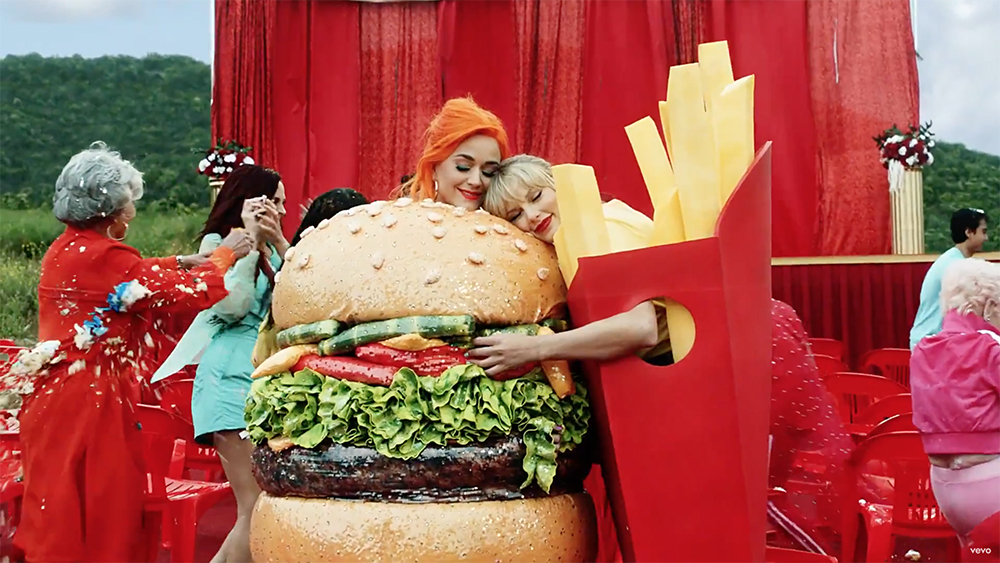 Taylor’s last look in the music video sees the singer in a giant foam french fries costume as she hugs Katy Perry, 34, who is dressed in a cheeseburger costume, concluded the video.