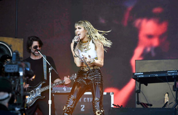 Miley Cyrus is seen performing at Glastonbury Festival, Worthy Farm, Pilton in Somerset in 2019 (AP)