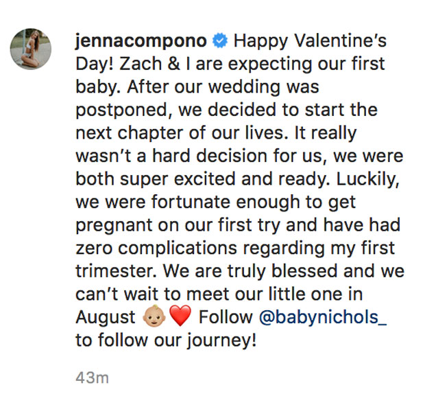 “Zach & I are expecting our first baby,” Jenna wrote on Instagram. “After our wedding was postponed, we decided to start the next chapter of our lives. It really wasn’t a hard decision for us, we were both super excited and ready. Luckily, we were fortunate enough to get pregnant on our first try and have had zero complications regarding my first trimester. We are truly blessed and we can’t wait to meet our little one in August.”