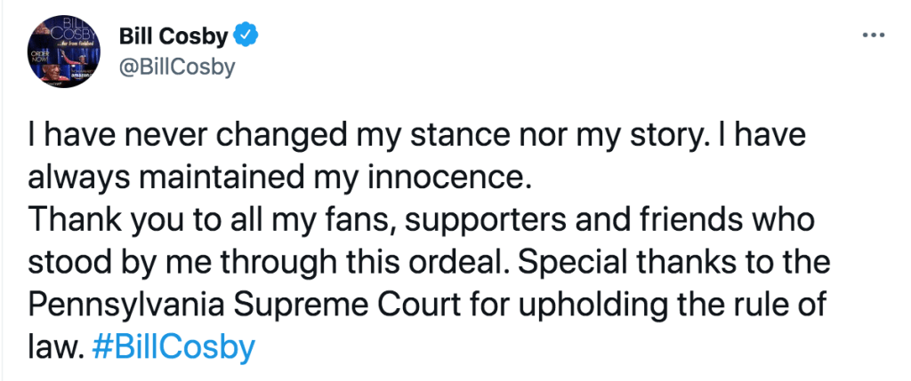 UPDATE (6/30/2021 @ 7:15 p.m. EST): Bill Cosby has broken his silence since returning home. “I have never changed my stance nor my story. I have always maintained my innocence,” he wrote via Twitter. “Thank you to all my fans, supporters and friends who stood by me through this ordeal. Special thanks to the Pennsylvania Supreme Court for upholding the rule of law. #BillCosby,” he added.
