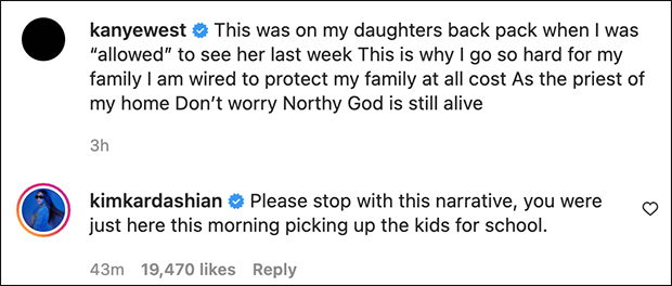 After Kanye uploaded the photo, Kim responded by pleading with him to stop trying to create a false narrative about the custody of their four children. “Please stop with this narrative, you were just here this morning picking up the kids for school,” she wrote.