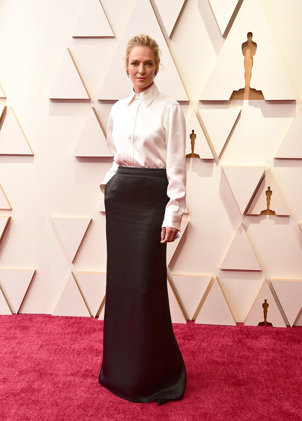 Uma Thurman is a film icon — and showed up looking like it at the 2022 Oscars! The 51-year-old walked the red carpet in a contemporary look that was entirely own, going with a silk, white button up shirt paired with a long black silk skirt by Bottega Veneta. The outfit was understated elegance, keeping the rest of her look simple with the shirt buttoned up all the way, opting for just a bit of bling with large diamond leaf earrings accented with an emerald.