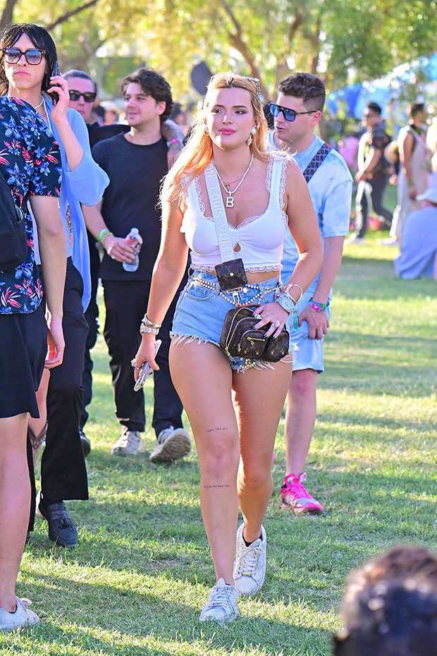 Bella Thorne, 24, was a standout during her time at Coachella on Friday! The beauty rocked a white lace crop top and Daisy Dukes as she walked around the popular music festival during its first day and night of performances. She also added white sneakers to her look and accessorized with bracelets and a necklace that showed off the initial “B.”