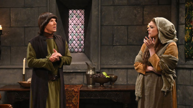 “The worst thing is that someone leaks this conversation to the town crier,” he added, as she indeed walked in, portrayed by none other than Cecily Strong, who “had a couple questions” about what she overheard. “Shouldn’t women have the right to choose since having a child means there’s a 50% chance of dying?” she pondered. After a unanimous vote between the three, the men decided to ban abortion — and in came a medieval-attired Kate McKinnon!