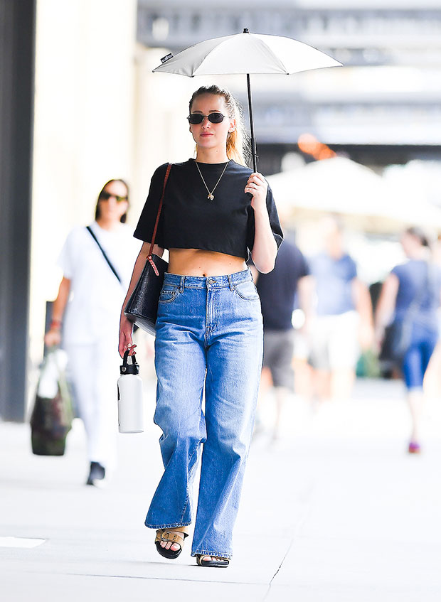 Jennifer Lawrence, 31, has been on her fashion A-Game lately! The Oscar winner looked gorgeous as she stepped out in a black crop top and straight leg, wide jeans in New York City on Saturday, July 30. Jennifer appeared to be on a rainy morning coffee run, as she held onto an iced latte in one and a trusty black umbrella in the other. She kept her blonde hair back in a casual pony tail on the outing, smiling for photographers passing by.