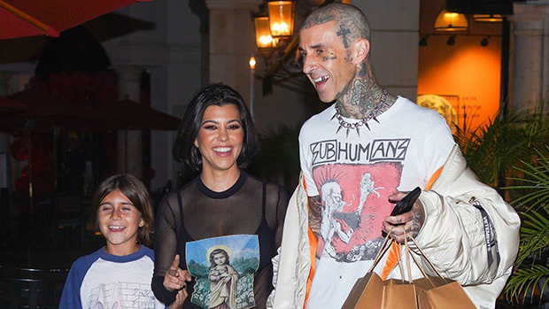 Kourtney Kardashian cuddled close to her hubby, Travis Barker, as they celebrated the opening of the Crossroads Kitchen in Calabasas’s open-air mall, The Commons, on Thursday (Oct. 13). Travis, 46, rocked a Subhumans shirt while he and Kourtney, 43, were all smiles when they exited the vegan eatery. They weren’t the only one who had a good time. Kourt’s daughter, Penelope Disick, joined her mother and stepfather for the outing.
