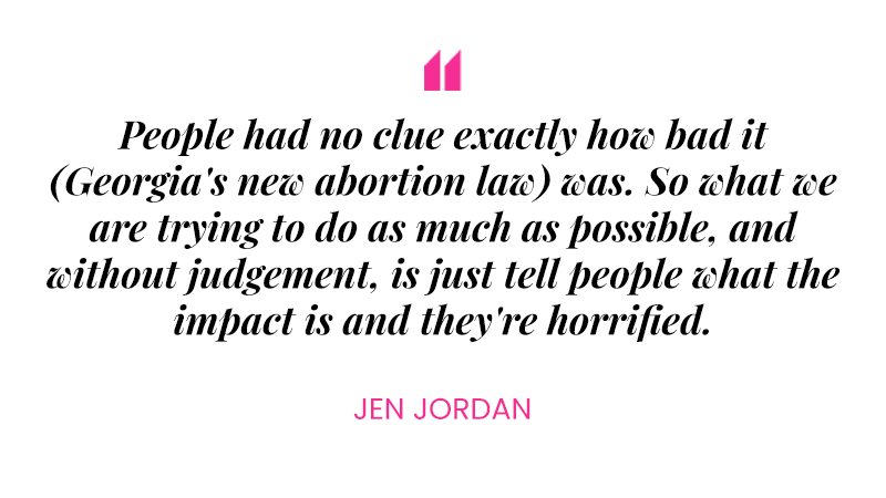 This is a legal first in the country and will have enormous impacts on women, health providers and potentially every person in Georgia. However, Jen Jordan, 48, has been finding that many of the women that she is meeting on the campaign trail are still totally unaware of the new law and its full effects.