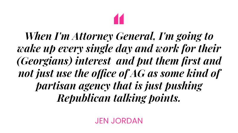 Jordan is running for Georgia’s Attorney General in the mid term election, after serving as a Senator in the state Legislature, because she wants to be an Attorney General for “the people” and not for one political party. “The current Attorney General [Chris Carr] just kind of views himself as an extension of the governor’s office [Brian Kemp], and does his bidding,” she claims. “So, for me, it’s really important to show that I am independent of that, and it really doesn’t matter who’s in the governor’s office, or the White House, my office is going to function the same, and it’s really going to be about the people.”