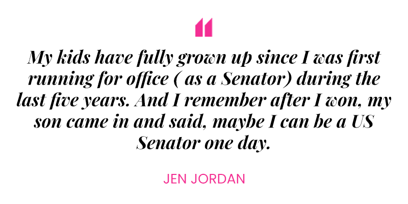 “My kids have really grown up since I was first running for office [as a senator] during the last five years. And I remember after I won, my son came in and said, ‘Maybe I can be a US Senator one day.'” She feels it’s very, very important that more women run for office so it becomes “much more normalized and it’s not a big deal.” She also feels very lucky to have a partner, like her husband, who is willing to “put up with this and support you, and he’s been incredible. So, I’m a very lucky person.”