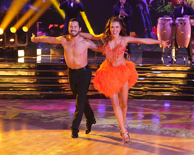 Trevor Donovan and Emma Slater start out with an epic salsa to “Barbie Girl” by Aqua dressed as Ken and Barbie. There’s one insane lift in the room that they nailed. Len Goodman calls the performance “so much fun” and “full of rhythm.” Derek Hough admits there were a “few awkward moments,” but he’s noticed Trevor’s “confidence.” Bruno Tonioli says that the “choreography and structure” was like “watching a sitcom set to music.” He adds that this was Trevor’s “most accomplished” performance yet. Trevor and Emma’s scores: Carrie Ann = 8; Len = 9; Derek = 8; Bruno = 9. Total Score = 34 out of 40.