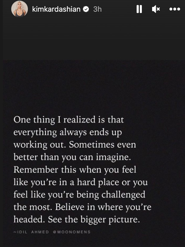 Kim Kardashian shared a quote on her Instagram Story with an enigmatic message about how things could get better, on Friday, November 18. The SKIMS founder, 42, posted the quote, seemingly by Idil Ahmed, shortly after it was reported that her ex-boyfriend Pete Davidson, 29, was dating Emily Ratajkowski, 31. Despite the message mentioning being in a “hard place,” it was about getting better.