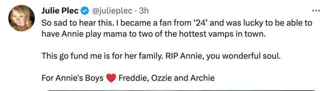 Julie Plec, the show runner for The Vampire Diaries, also posted a tribute via Twitter. “So sad to her this. I became a fan from ‘24’ and was lucky to be able to have Annie play mama to two of the hottest vamps in town,” she wrote. “This go fund me is for her family. RIP Annie, you wonderful soul. For Annie’s Boys… Freddie, Ozzie and Archie,” she also said.