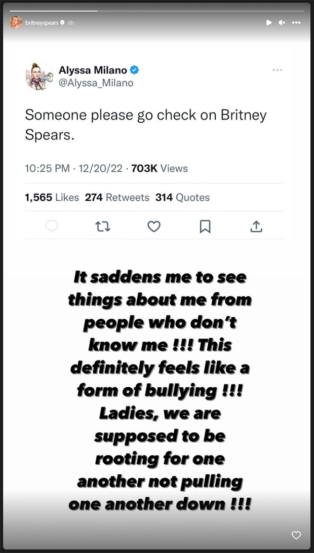 Original: Less than twenty-four hours after Britney Spears reactivated her Instagram, causing fans to call a welfare check on her, the 41-year-old pop icon called out one of those “concerned” people: Alyssa Milano. Alyssa, 50, tweeted, “Someone please go check on Britney Spears” on Dec. 21, 2022. “It saddens me,” Britney wrote on her Instagram Story while sharing Alyssa’s tweet, “to see things about me from people who don’t know me!!!