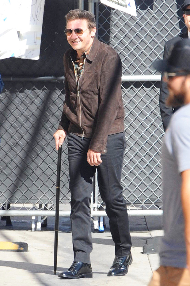 UPDATE: On April 10 — two weeks after Jeremy was seen walking on a treadmill — he was pictured walking with a cane ahead of filming an appearance on Jimmy Kimmel Live! He had a big smile on his face and looked to be in high spirits. See that photo below!
