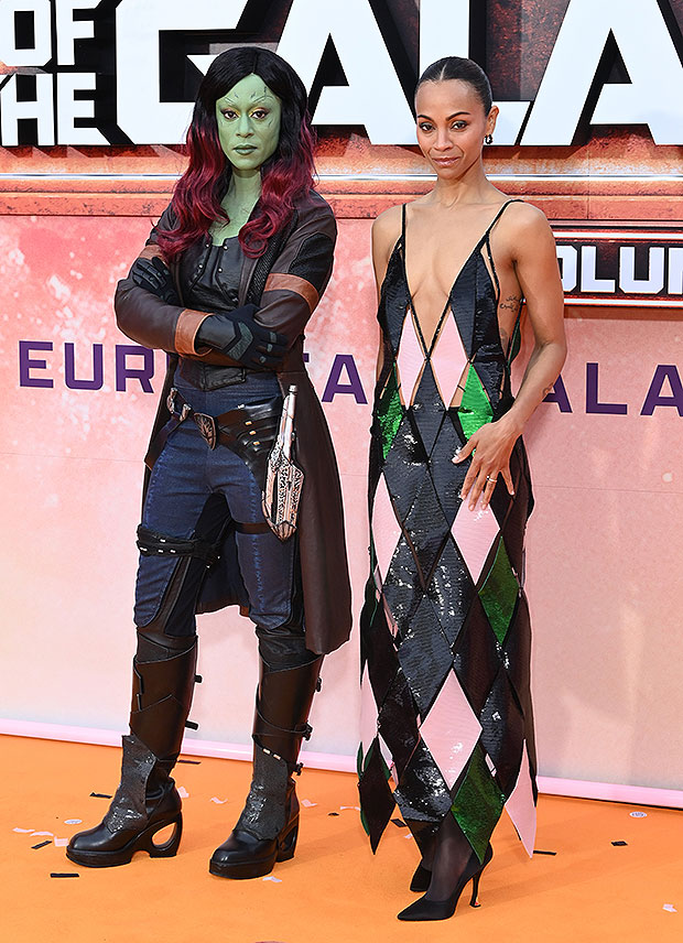 Zoe Saldaña knew the assignment for the European premiere of Guardians of the Galaxy Vol.3 at Disneyland Paris on April 22. The stunning actress rocked a plunging harlequin dress for the red carpet event as she stopped for a few snaps alongside her co-star Chris Pratt. Even more exciting, she posed with an actress dressed up as her character in the film, Gamora!