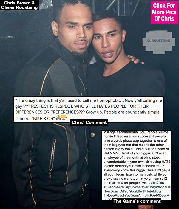Haters gonna hate! Chris Brown, 27, took to social media to shut down internet trolls who were slamming him for being in a gay relationship with French fashion designer Olivier Rousteing, 30. The two were snapped in a photo together, and people were quick to assume they’re in a gay relationship. Rapper The Game, 36, even came to Chris’ defense. Check out their message to the haters!