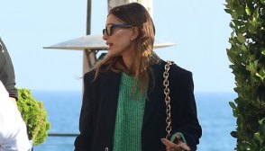 Hailey Bieber was a fashionable sight when she showed up to Nobu Malibu in a green sweater under a black blazer and black skirt while also accessorizing with a matching purse.