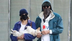 The cool looking couple were spotted with their arms around each other and walking a cute white dog while carrying leftovers.