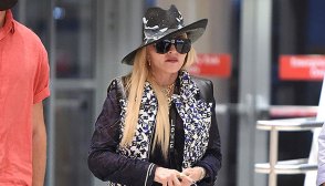 Madonna looked incredible while wearing a black, purple, and white Louis Vuitton vest and baggy black pants while walking in New York’s John F. Kennedy Airport on Saturday.