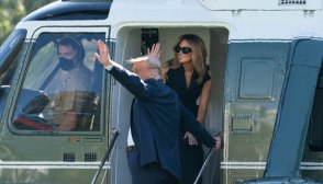 Melania Trump flashed a rare big smile while getting off a helicopter with Donald Trump as they traveled to the final presidential debate, and critics used theories about why it was a ‘fake Melania’.