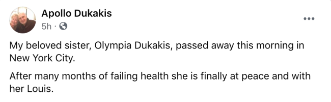 Olympia Dukakis has passed away at the age of 89. News of the Oscar winner’s passing was confirmed by her brother Apollo Dukakis, 85, via Facebook on Saturday, May 1. “My beloved sister, Olympia Dukakis, passed away this morning in New York City,” he wrote in his post. “After many months of failing health she is finally at peace and with her Louis,” the fellow actor wrote, including as gorgeous headshot of the Moonstruck actress. Learn more about Olympia here.