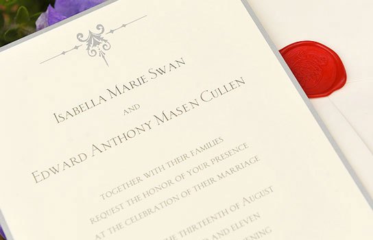 “Isabella Maria Swan and Edward Anthony Masen Cullen together with their families request the honor of your presence at the celebration of their marriage, Saturday the thirteenth of August two thousand and eleven five o’clock in the evening.”