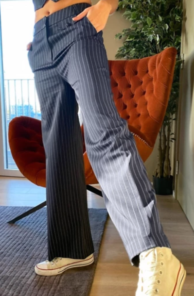 4. Labelrail x Hana Cross Wide Leg Menswear Pant in Navy Pinstripe