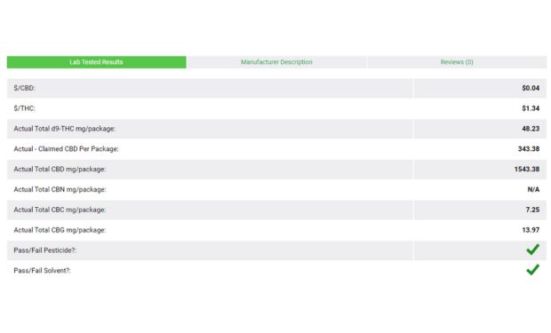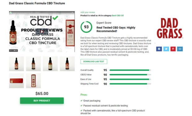 This full-spectrum CBD tincture from Dad Grass is exactly what we look for when testing and reviewing CBD products. It is packed with cannabinoids, tests over the label claim for CBD, and is moderately priced at $0.04/mg of CBD. This CBD tincture also passed residual solvent & pesticide testing; and, like all Dad Grass products, has terrific packaging. If you’re looking for a trustworthy full-spectrum product that contains a wide range of cannabinoids, this is a great place to start!