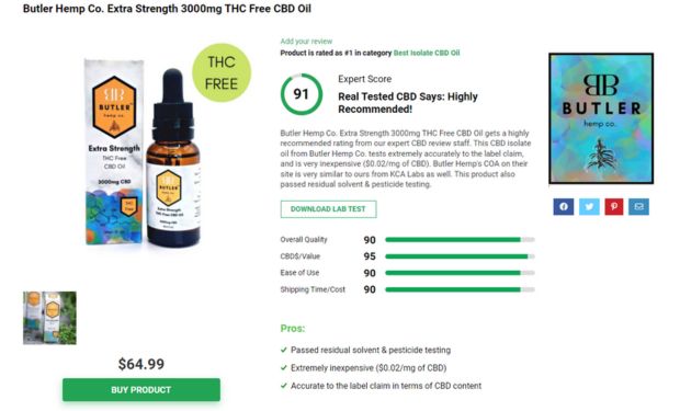 This CBD isolate oil from Butler Hemp Co. tests extremely accurately to the label claim, and is very inexpensive ($0.02/mg of CBD). While this product doesn’t contain any cannabinoids other than CBD, it is one of the very best CBD isolate products on the market. Butler Hemp’s COA on their site is very similar to ours from KCA Labs as well. This product also passed residual solvent & pesticide testing. Give this product a try if you’re only looking for CBD and no other cannabinoids.