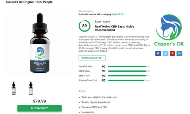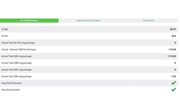 This broad-spectrum CBD oil from Casper’s Oil tests extremely accurately to the label claim of 1000 mg of CBD. While it doesn’t contain any detectable amounts of THC, it does contain some CBDV and CBG. It’s the presence of these other, more rare cannabinoids that differentiate this broad-spectrum product from a CBD isolate product. At just $0.07 per mg of CBD, it’s very affordable, and it passed all residual pesticide and solvent testing!