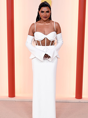 Mindy Kaling was an absolute vision in her white custom Vera Wang gown featuring dramatic sleeves and a daring bodice.