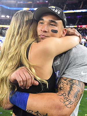 After Jake Funk won the 2022 Super Bowl with the Los Angeles Rams, he celebrated on the field with his girlfriend, Hannah Ann Sluss, who is best known for her time on ‘The Bachelor.’