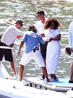 The TV icon was all smiles as she enjoyed a sunny boat ride to a beautiful restaurant during her Italian summer getaway.