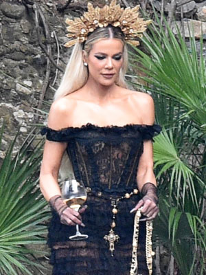 Khloe Kardashian Dazzles In Gold Headpiece & Black Dress At Kourtney & Travis’ Italian Wedding